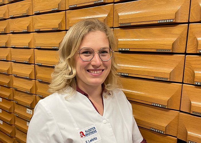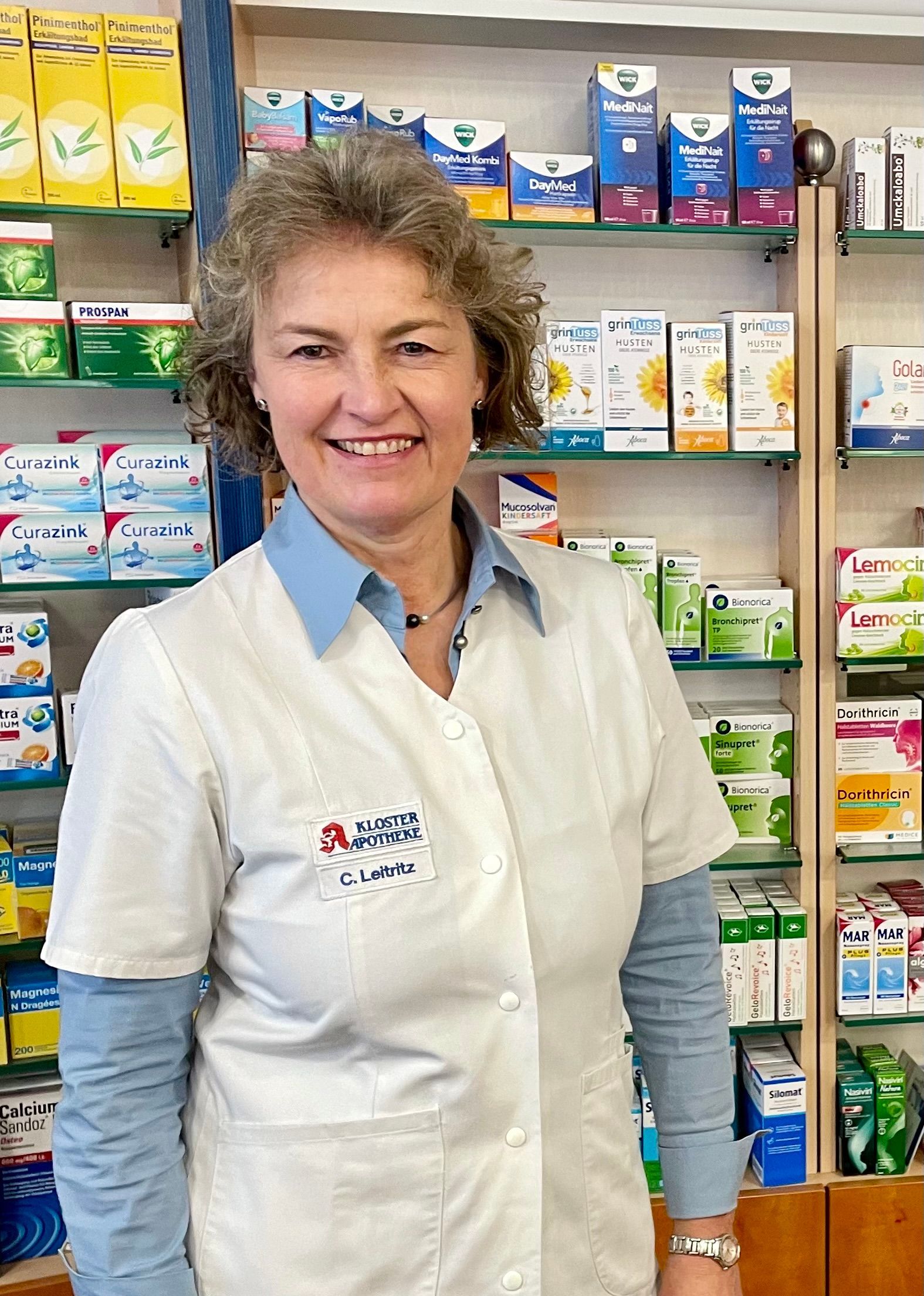 Apothekerin für Allgemeinpharmazie mit Schwerpunkt Homöopathie und Naturheilkunde. Sie hat die Kloster-Apotheke 2005 von ihrem Schwiegervater Ernst Leitritz übernommen: